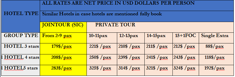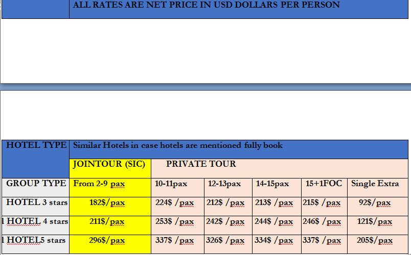 PRICE TARIFF: NET PRICE USD/PER PAX (Adult)
